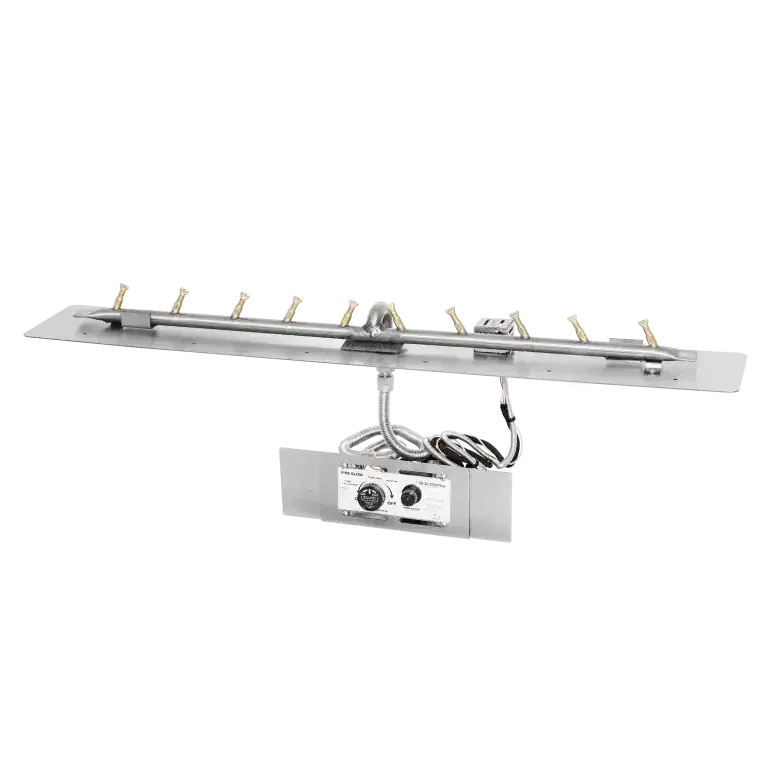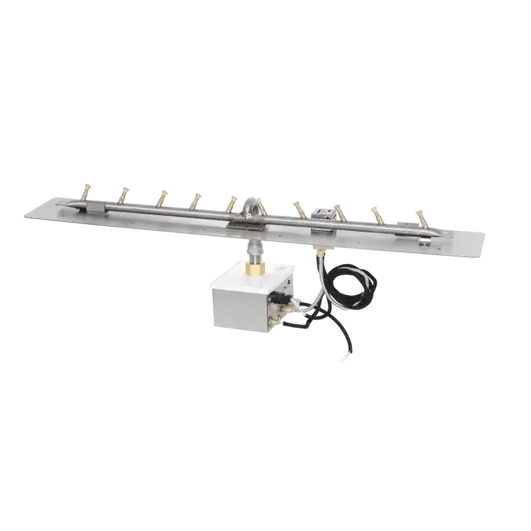 The Rectangular Flat Pan & SS Linear Bullet Burner by The Outdoor Plus is a sophisticated fire pit insert designed to provide a striking, elongated flame for rectangular fire features. This system is powered by the patented Linear Bullet Burner, which uses specialized brass orifices to create a taller, fuller flame while consuming significantly less fuel than traditional linear burners. The high-quality 304 stainless steel flat pan provides a sleek, low-profile finish that integrates seamlessly into modern landscape designs. Available in a wide variety of lengths ranging from 24 to 96 inches, this versatile kit can be customized with multiple ignition options—including match-lit, flame sense, and advanced electronic systems—making it an ideal choice for large-scale residential or commercial outdoor living spaces.