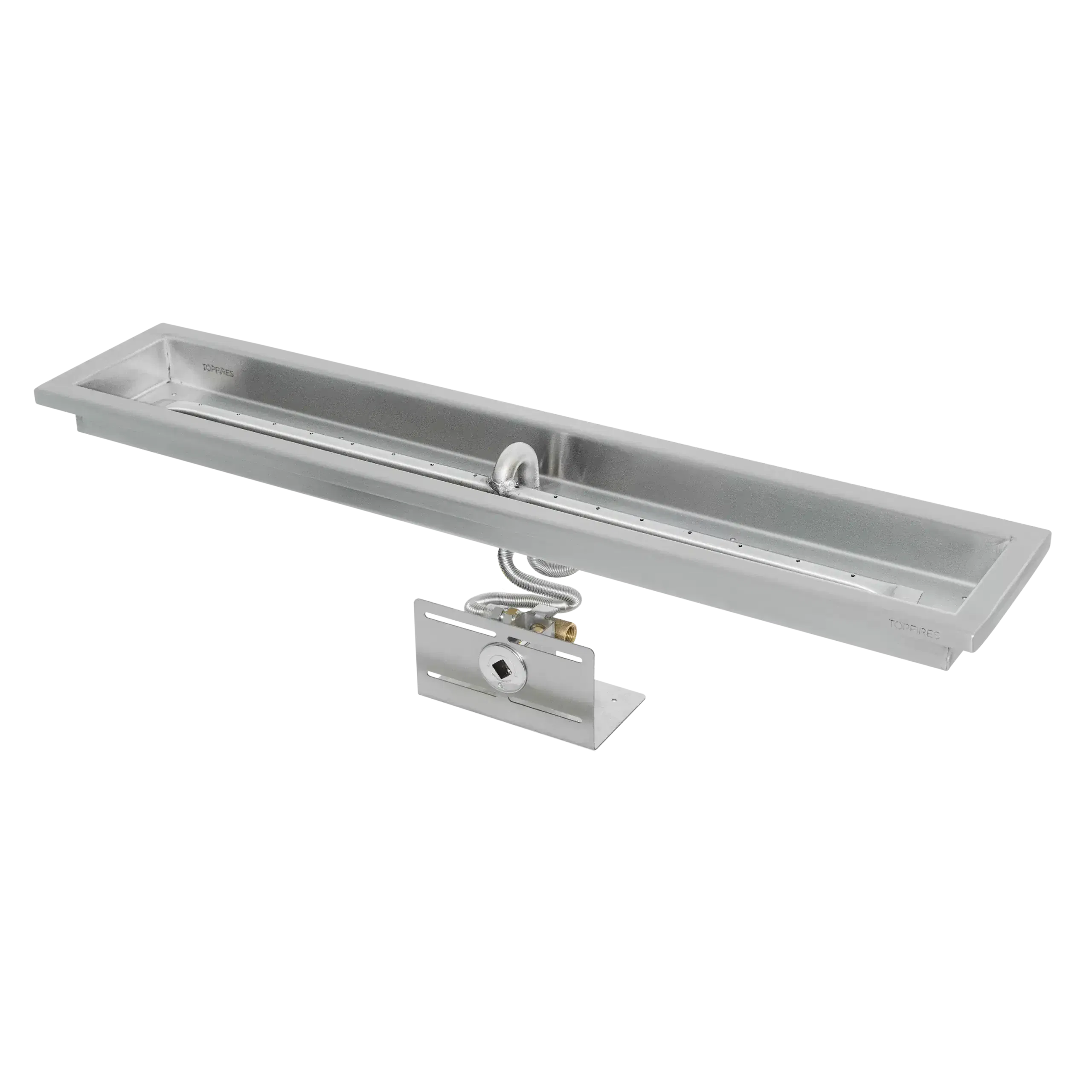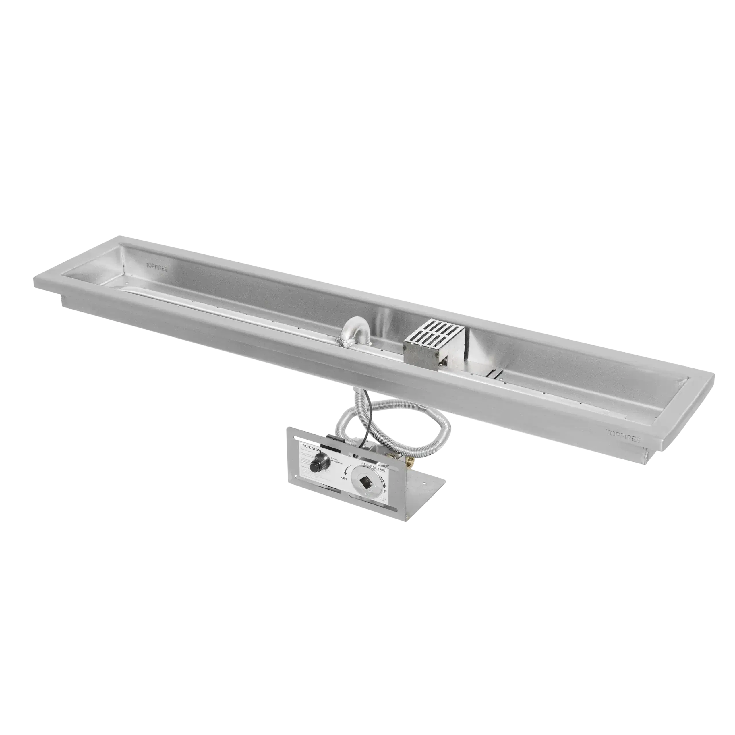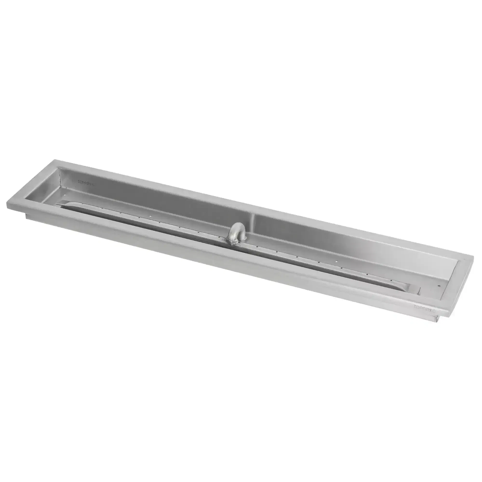 The Raised Lip Rectangular Drop-In Pan & Linear SS Burner by The Outdoor Plus is a high-performance fire pit kit designed for effortless installation and superior water protection. It features a unique 1-inch raised center hub that keeps water and debris away from the burner ports, ensuring a reliable flame in all weather conditions. Handcrafted in the USA from 304-grade stainless steel, this durable system includes a lifetime warranty on the burner and a 1-inch outer lip for a secure “drop-in” fit. Available in multiple sizes and ignition types, it is the ideal, low-maintenance solution for a sleek and professional linear fire feature.