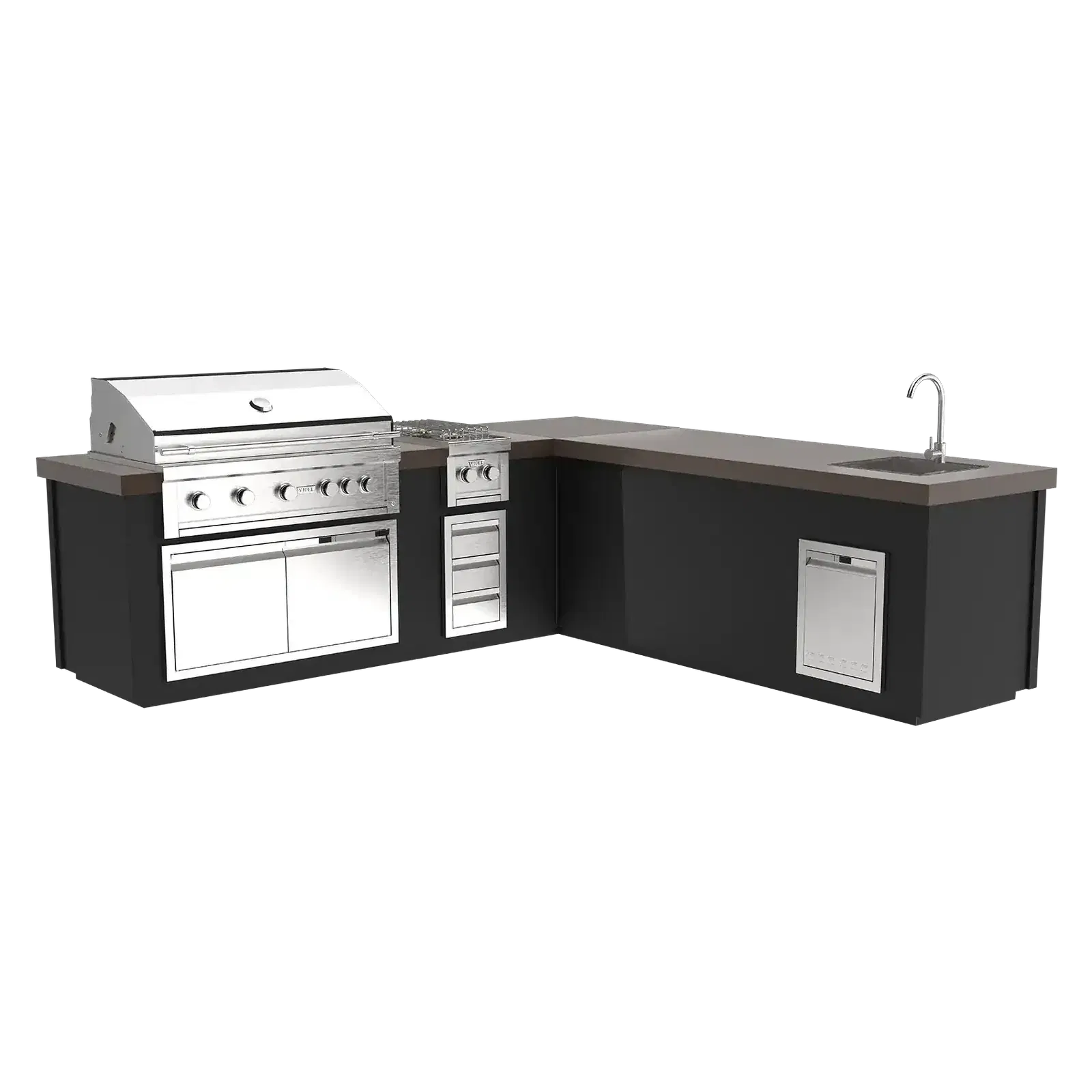 The Maestro 112L BBQ Island, a spacious and superbly appointed centerpiece for any large patio or backyard. Crafted in an elegant “L” shape, the Maestro 112L features our high-performance Gran Fuego 42, a versatile Fuego Vivo Side Burner, and ample storage with 42″ Double Doors, a Triple Access Door, and a Single Access Door. The inclusion of a sink adds convenience and style, making this BBQ Island a must-have for those with a flair for outdoor gatherings and gourmet grilling.